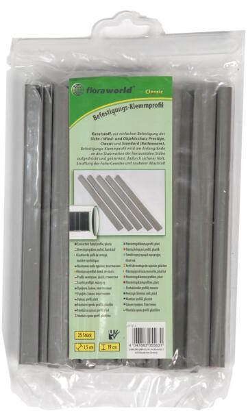 Műanyag, a Prestige, Classic és Standard belátás elleni, szél elleni és objektumvédelem egyszerű rögzítésére (méteráru). A rögzítő szorítóprofilt a vízszintes pálcák elejére/végére kell rányomni és rászorítani. Ez biztos tartást, a fólia/szövet megfeszítését és szép lezárást garantál.